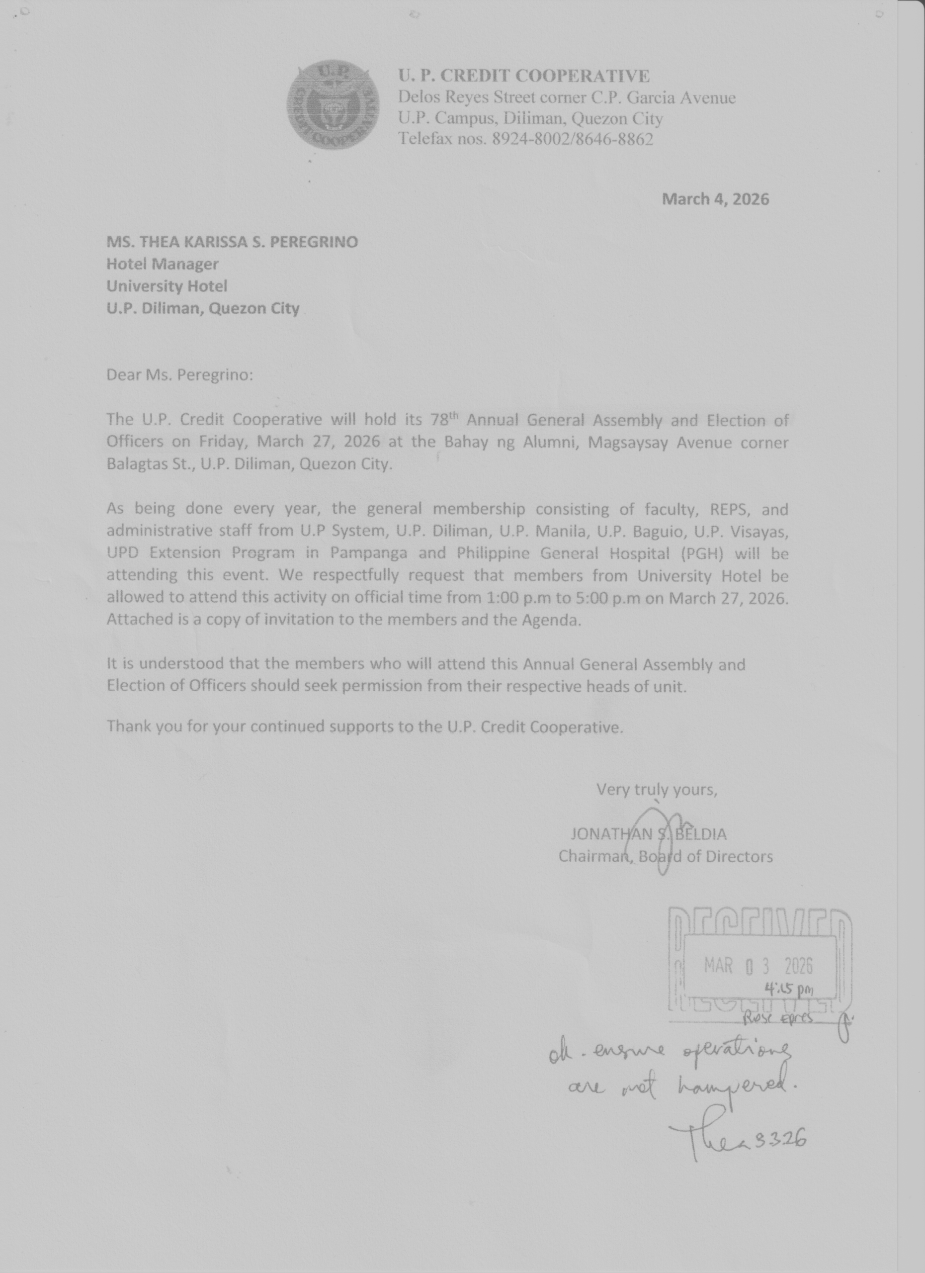 Para sa ano mang katanungan tungkol dito ay maari pong tumawag sa Tagapamahala ng ating Kooperatiba na si Gng. Sherlaine D. Reyes sa telepono bilang 8924-8002 at 8646-8862.
